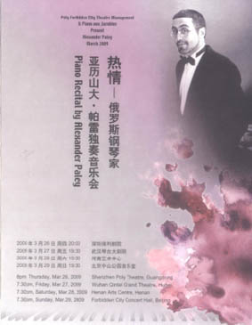 國際著名鋼琴大師-博蘭斯勒鋼琴藝術家-亞歷山大.帕雷,很 多國外的鋼琴愛好者們對于這個名字早已如雷貫耳,對于中國的樂 迷們來說也并不陌生。2006年亞歷山大.帕雷就以博蘭斯勒鋼琴藝 術家的身份獻技于北京故宮,并以精湛的琴技征服了在場每一位觀 眾的心.2009年3月-4月,亞歷山大.帕雷再次受邀來到中國,并以貝 多芬名曲《熱情》作為主題.分別在深圳、武漢、鄭州、北京等城 市開始了本次中國巡演之行。