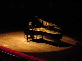 有著“鋼琴詩(shī)人”美譽(yù)的世界殿堂級(jí)鋼琴 家趙胤胤 先生在本 場(chǎng)音樂會(huì)上共表演四首曲目,分別是古典風(fēng)格的莫扎特《鋼琴奏鳴 曲K331 》、浪漫唯美的中國(guó)民間經(jīng)典《梁?!贰⒗钏固刂磷鸺?jí)作 品《愛之夢(mèng)》與第一部融爵士樂和交響樂風(fēng)格于一體的《藍(lán)色狂想 曲》。整個(gè)美好的夜晚,趙胤胤靈動(dòng)的手指在黑白琴鍵間輕快飛舞 ,化為一串串醉人的音符,時(shí)而豪放飛揚(yáng),時(shí)而寧?kù)o舒緩,猶如一 個(gè)巨大的磁場(chǎng),深深地吸引著聽眾,每個(gè)部分演奏完畢,雷鳴般的 掌聲一陣熱過一陣,他用四首曲目征服了現(xiàn)場(chǎng)所有人。