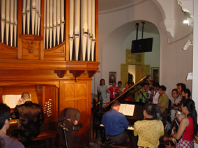 ?。常比胀黹_幕式音樂會(huì)上,來自澳大利亞的兩位著名音樂家——鋼琴家杰弗利·托薩和管風(fēng)琴演奏家瑞思·博克,聯(lián)袂演奏由法國(guó)浪漫派作曲家法蘭克和英國(guó)作曲家彼得斯所作的兩首鋼琴與管風(fēng)琴合奏作品。合奏音樂會(huì)上使用的鋼琴是鼓浪嶼鋼琴博物館珍藏的1937年的博蘭斯勒(Blüthner)鋼琴,管風(fēng)琴與鋼琴合奏,這在國(guó)內(nèi)尚屬首次。