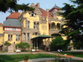 據(jù)賓館工作人員介紹,青島迎賓館前身是德國駐膠澳總督官邸,1922年成為膠澳商埠督辦官邸,1934年由時任市長題名為“迎賓館”,迎賓館由表及里充滿著舒展流暢、粗獷華貴的藝術(shù)氣質(zhì),墻壁上的銅雕藝術(shù)品、五顏六色的吊燈、彩色玻璃天窗、結(jié)合古老的博蘭斯勒鋼琴,無不使人恍若置身異域。