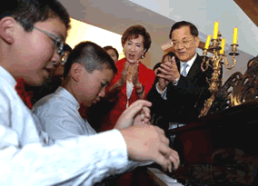 連戰(zhàn)先生在廈門大學接受名譽博士后,隨即攜夫人連方瑀來到素有鋼琴島之稱的鼓浪嶼,參觀了鼓浪嶼鋼琴博物館。在這里,小朋友們?yōu)樗I上了精彩的音樂表演。為連戰(zhàn)先生演奏鋼琴的小同學最大的十一歲,尤其精彩的是,有兩位小朋友在一架德國產(chǎn)博蘭斯勒Blüthner古鋼琴上四手聯(lián)彈為連戰(zhàn)先生獻上一曲《西班牙舞曲》,配合默契、彈奏流暢,優(yōu)美的旋律令在場的每一個人陶醉。連戰(zhàn)夫婦一邊欣賞著美妙動聽的音樂,一邊為小朋友嫻熟的彈奏技巧鼓掌叫好,當?shù)弥糜谘葑嗟倪@架博蘭斯勒Blüthner鋼琴已有接近70年歷史時,連戰(zhàn)先生更是對其完美的音質(zhì)表現(xiàn)贊不絕口。