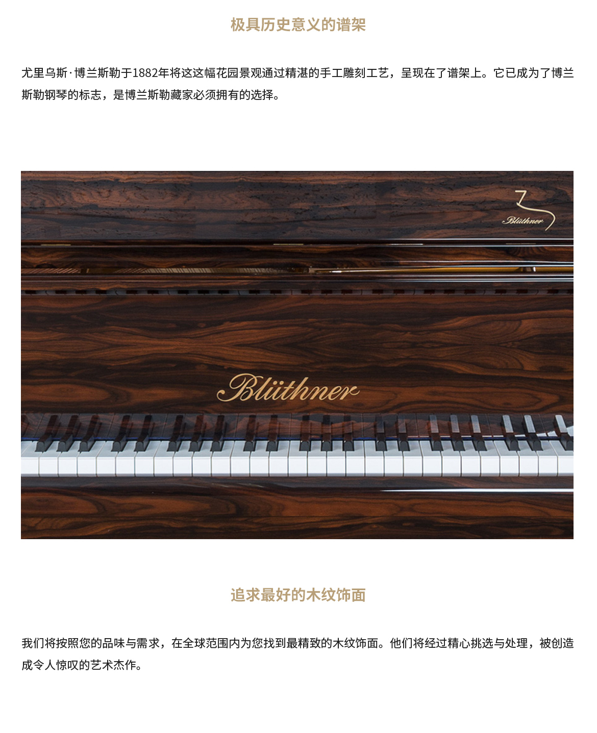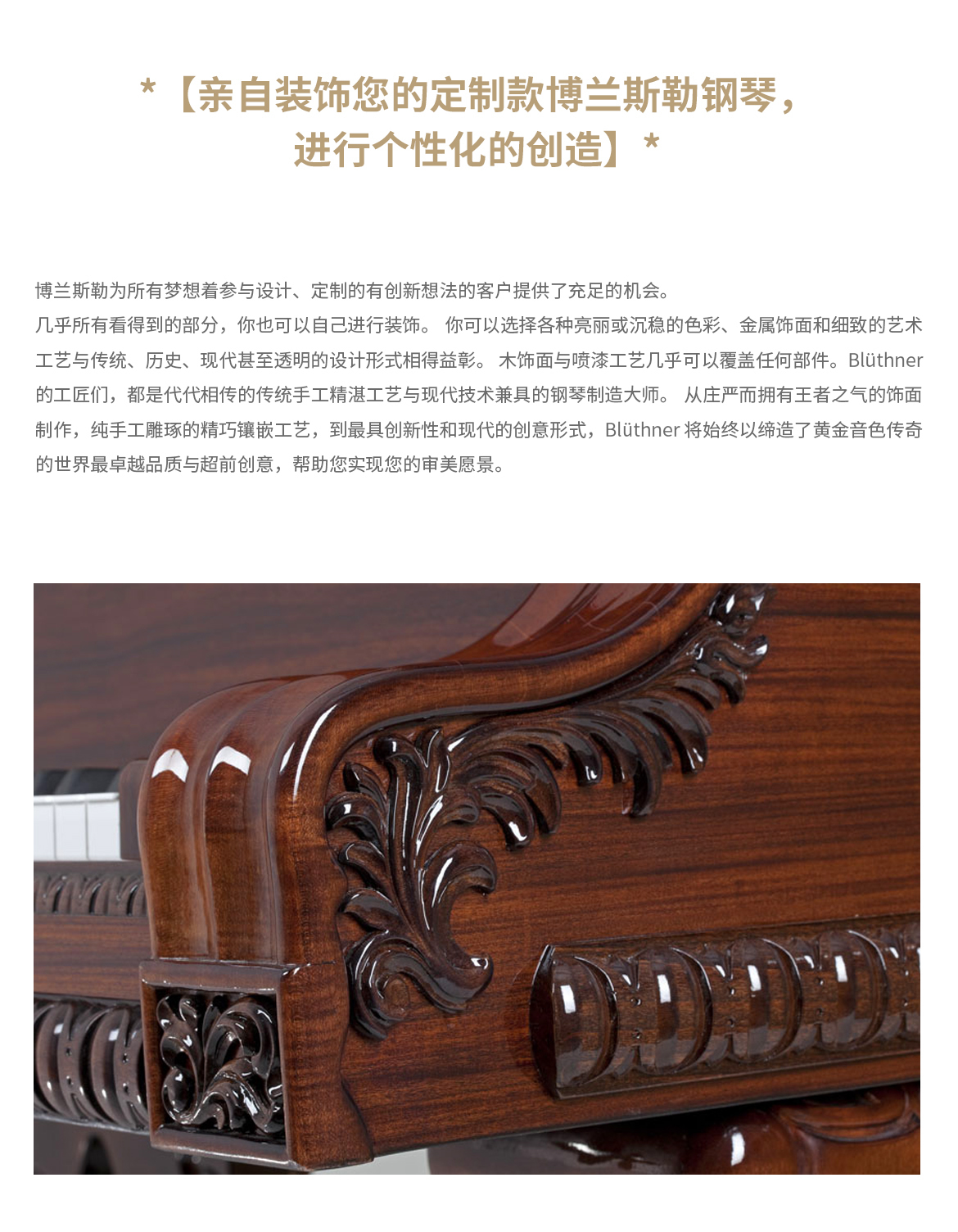 每臺(tái)鋼琴均接受定制,可根據(jù)您的品味或需求指定特殊飾面與個(gè)性化裝飾。從典雅的鑲木板材與手工雕刻鑲嵌工藝,到最具創(chuàng)新性的現(xiàn)代藝術(shù)造型,博蘭斯勒皆可助您實(shí)現(xiàn)美學(xué)構(gòu)想。